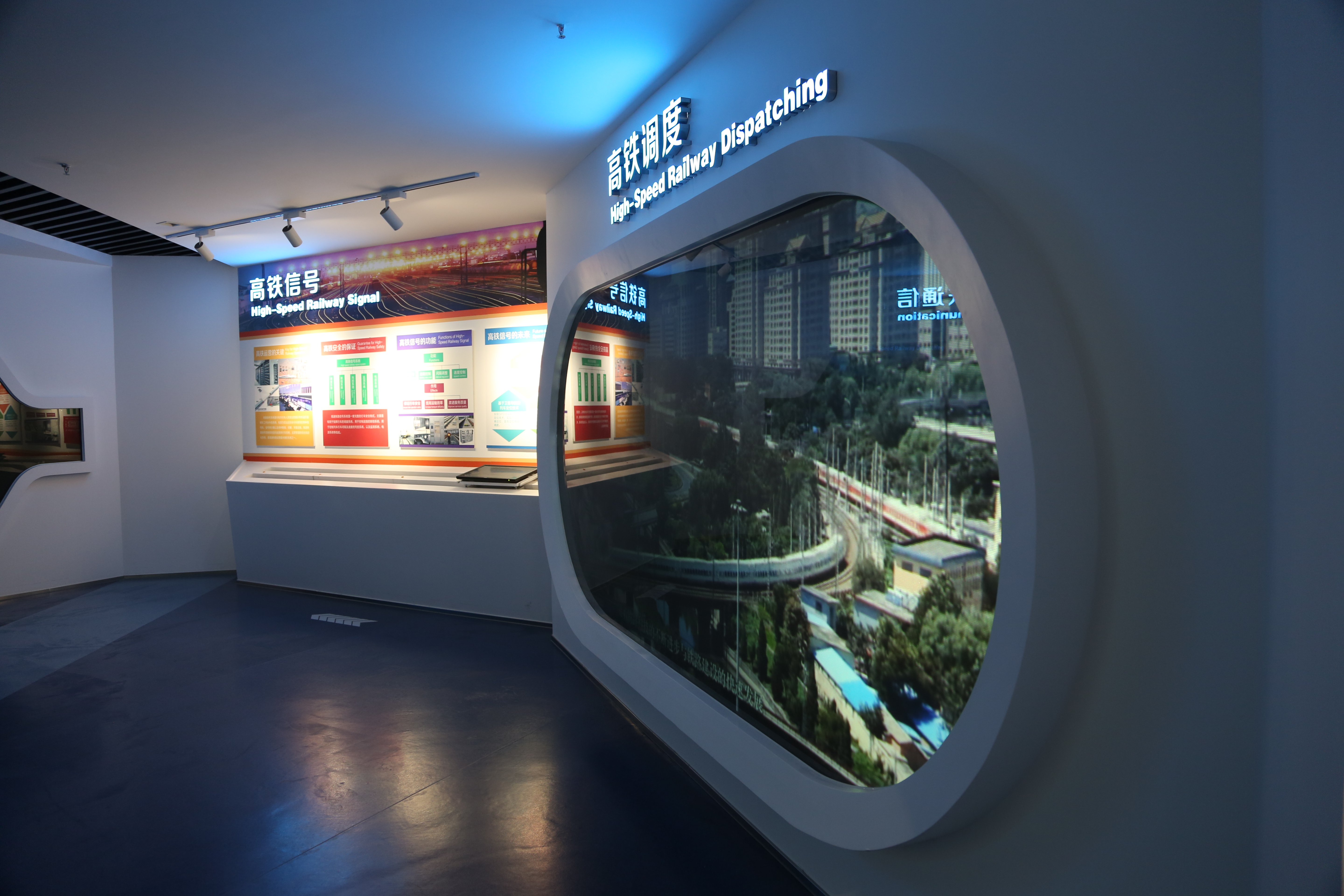 武漢高鐵展覽館,位于湖北省武漢市武漢高速鐵路職業技能訓練段內。為在接待非專業人士參觀之外滿足職業人士的學習需求,展覽館設在訓練段綜合教學樓,兼顧教學功能。展館設計上最大的亮點就是以“高速鐵路的發展”為線索和重要元素,將高鐵的過去、發展、成果、未來及高鐵技術轉變成可觸摸、可互動的趣味性展項,營造“科技創造高鐵”的主題氛圍,強調高速鐵路的現代科技高速動感。