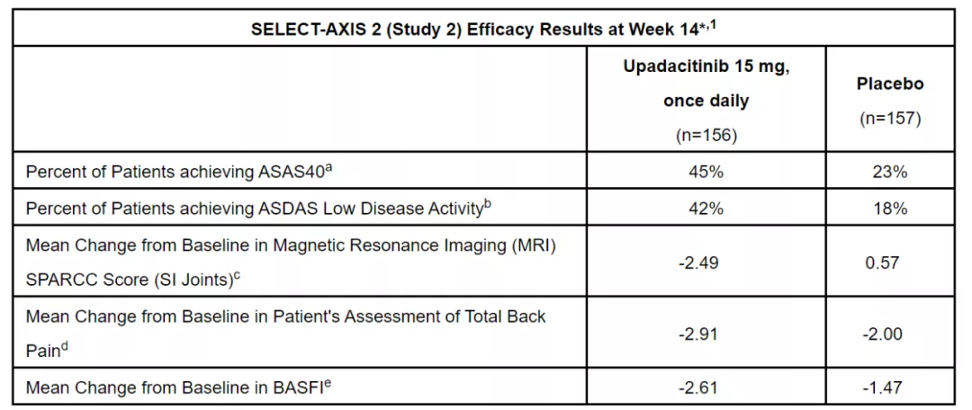兩項3期臨床試驗結果表明,在第14周時,無論在非放射學中軸型脊柱關節炎(nr-axSpA)患者,或在生物制品治療效果不佳的活動性強直性脊柱炎(AS)的患者中,與安慰劑相比,烏帕替尼組更多患者達到國際脊柱關節炎協會(ASAS)40應答。患者癥狀獲得統計學顯著的減輕,包括背痛和炎癥,以及身體功能和疾病活動度的改善。中軸型脊柱關節炎是一種累及脊柱的慢性炎癥性疾病,會引起背痛、活動受限和結構損傷。