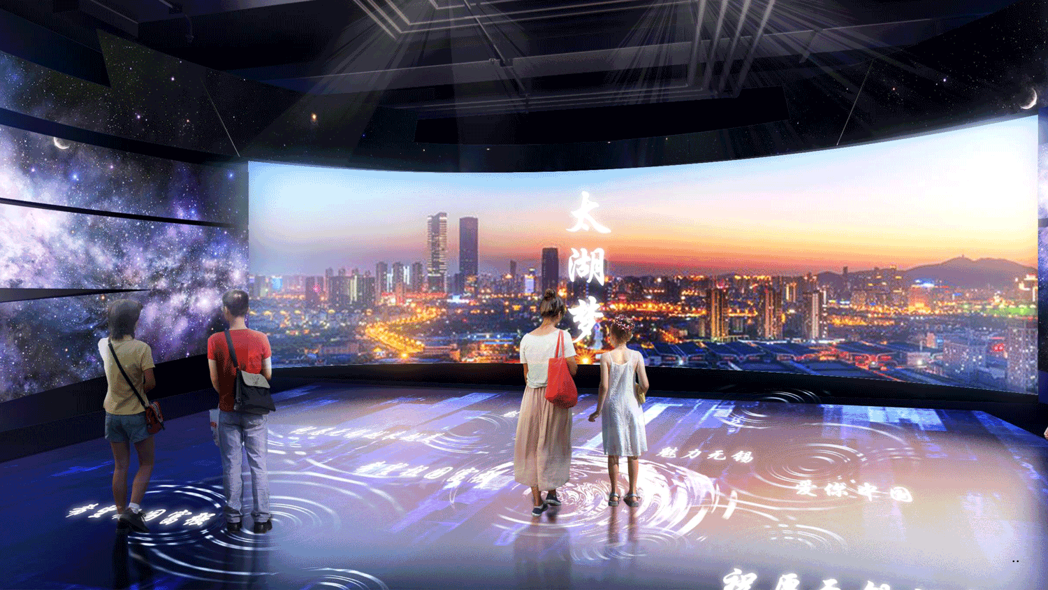 在《太湖美》的悠揚樂聲中開啟一段筑夢之旅,展望更美好的城市未來。運用大型投影互動墻的形式使觀眾在此體驗未來無錫人的1天,在智能生活、消費水平、便捷出行、健身運動、學習工作等方面暢想美好生活。