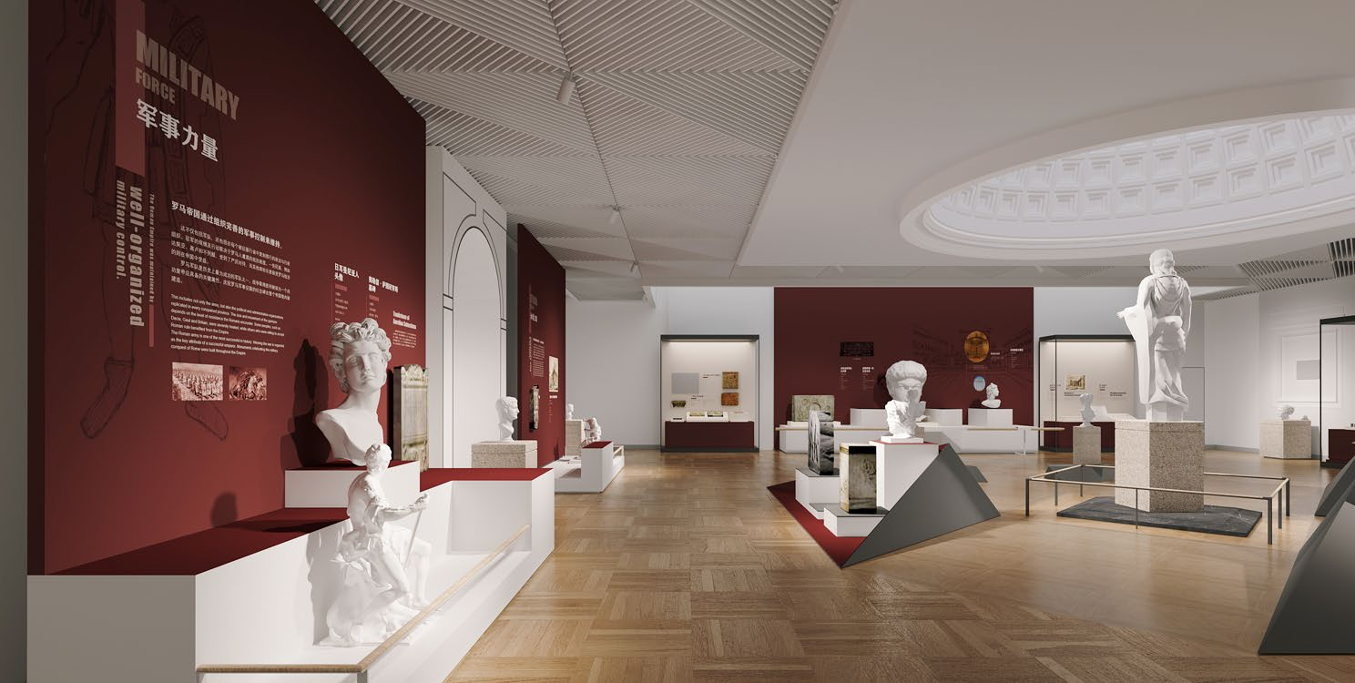 展廳運用了紅、黃、白的色調,鮮明區(qū)分展覽的敘述章節(jié);古羅馬建筑元素和AR實景互動帶領人們一秒穿越古羅馬,追溯“永恒之城”羅馬的起源發(fā)展,了解疆域廣闊的羅馬帝國如何輻射歐亞非文明的過程。