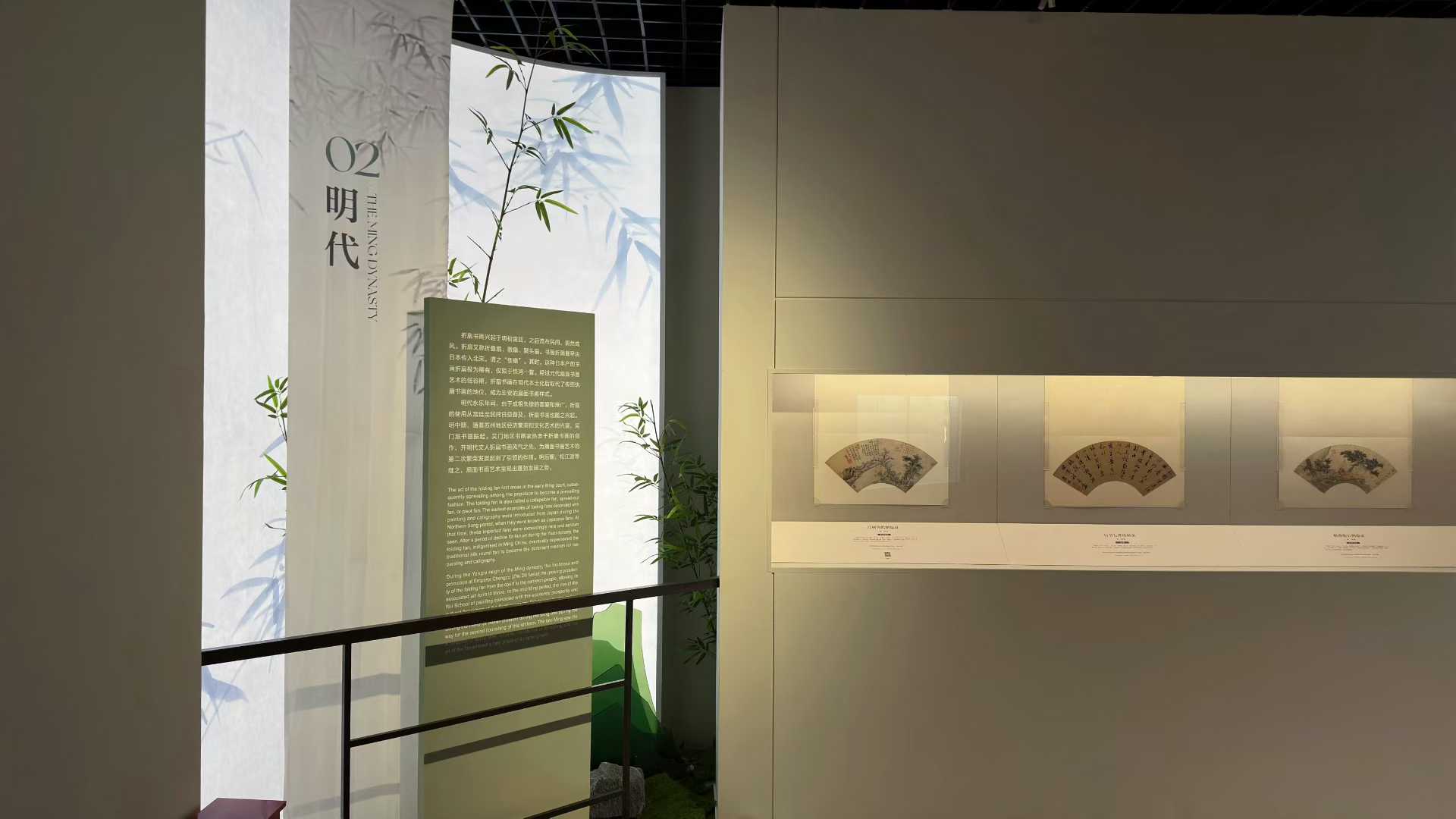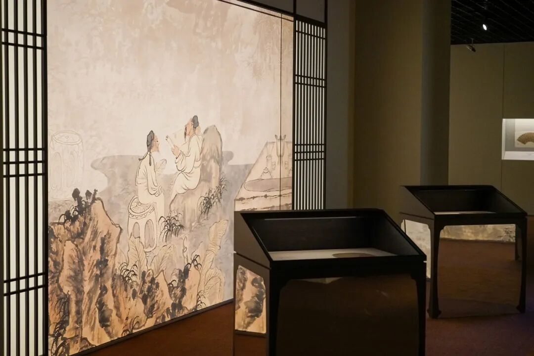 輔線展品以立軸、手卷等形式,呈現(xiàn)繪畫中的扇文化內(nèi)涵,其展示設(shè)計(jì)以“竹”為視覺元素,營造清雅意境,突出扇文化所蘊(yùn)含的文人精神追求。